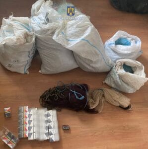 În cadrul activităților desfășurate, la două imobile ce aparțin unui bărbat, de 34 de ani au fost identificate trei cartușe, un prostovol, șapte plase de pescuit multifilament, două plase de pescuit monofilament și 35 de pachete de țigarete care nu erau marcate.